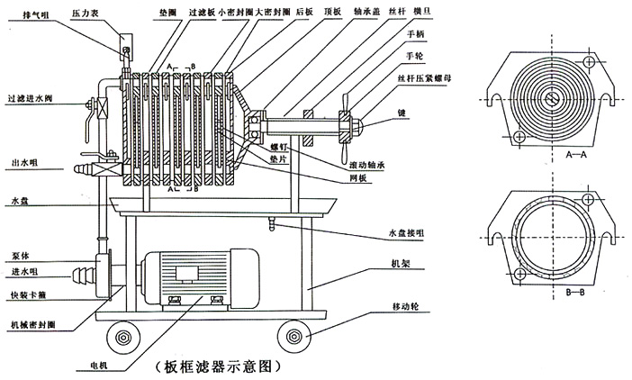 板框過濾器使用須知:1、使用前注射水消毒。2、將濾材用蒸餾水浸濕后貼在網(wǎng)板上,再壓緊頂板。3、啟動前先把泵內(nèi)加滿液體,再關(guān)閉進(jìn)液泵,然后啟動,逐漸打開液閥,并打開排氣閥排出機(jī)內(nèi)空氣。4、關(guān)閉時先關(guān)閉進(jìn)液閥,再關(guān)機(jī),防止突然停止液體回流擊環(huán)濾材。