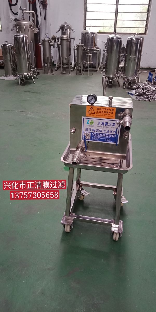 本機為不銹鋼多層板框壓濾機,適用于濃度50%以下粘度較低,含渣量較少的液體作密閉過濾以達到提純,滅菌、澄清等精濾、脫活性碳、除微粒、半精濾的要求,直接選用微孔濾膜,可不經微孔薄膜過濾器過濾可達到無菌過濾之目的)。本機過濾面積大,流量大,適用范圍大,所以在制藥、化工、食品等行業(yè)有廣泛用途,應用在制藥廠針劑藥液之過濾,效果甚佳。